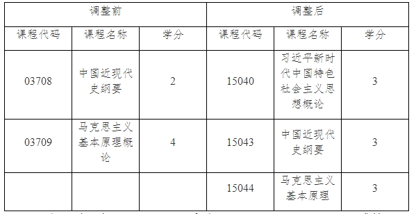 一、调整后高等教育自学考试本专科层次专业的思想政治理论课均设置3门课程,共9学分,调整前后的变化如表所示。
